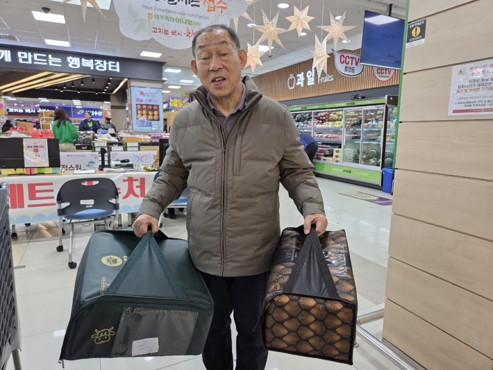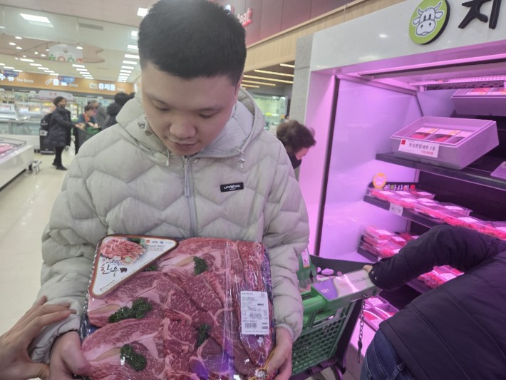 소고기, 과일 등 먹음직스런 선물들을 가득 싣고서