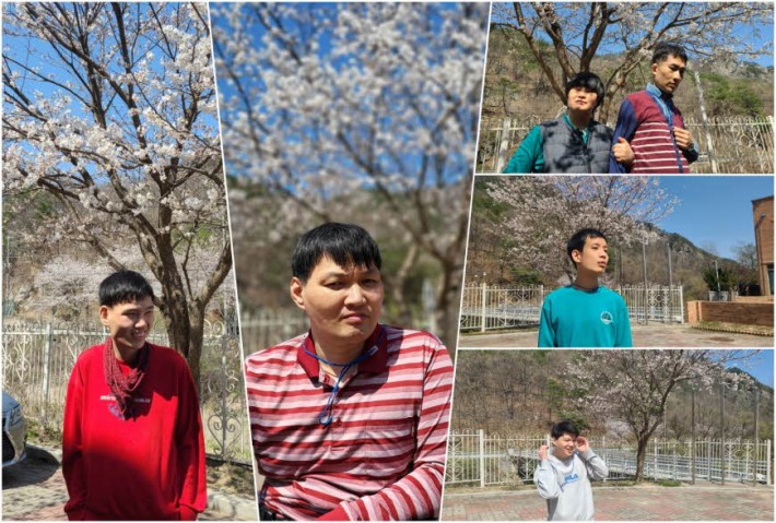 시설 내 정원에 벚꽃이 만개하여 가족들과 함께 활짝 핀 꽃들을 보며