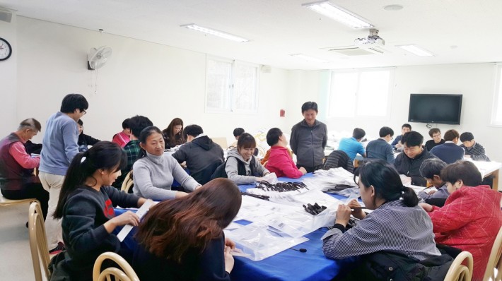 한국산업기술시험원(강원분원)에서 보호작업장에서 봉투 접기, 빵만들기 등을 지원해 주셨습니다.