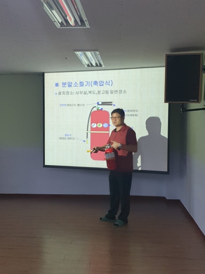 3분기 소방교육을 실시하였습니다. 소화기 사용법과 화재시 대피요령에 대해 알아보았습니다.