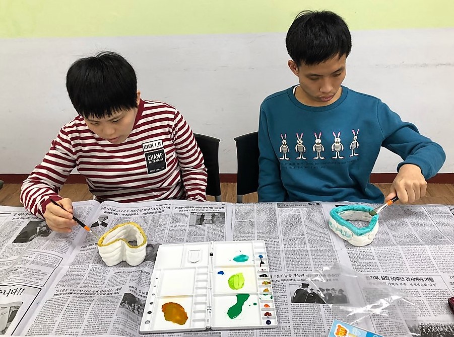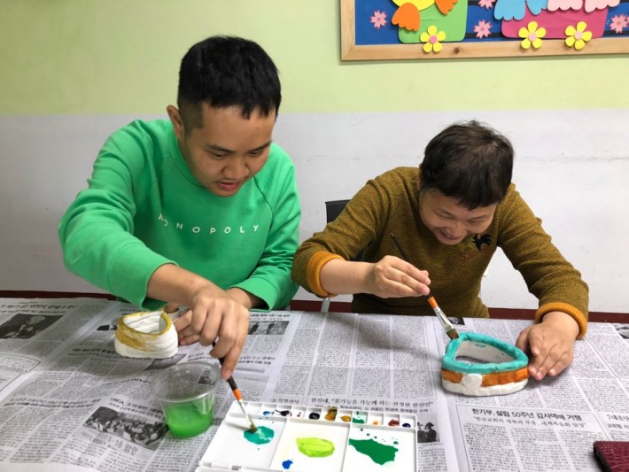 지점토로 도자기를 만들고 색을 칠하는 수업이 있었습니다. 물감이 손이며 얼굴에 묻어 깔깔대며 더 재미있던 시간었습니다.