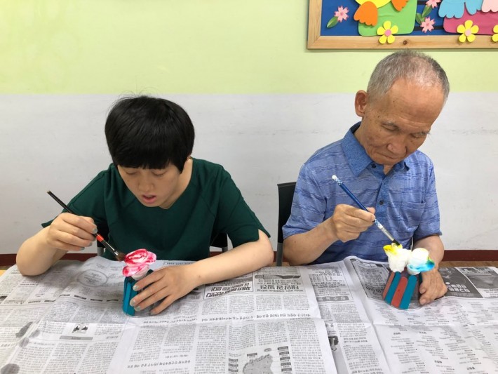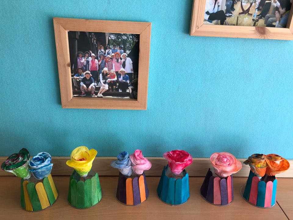이용인분들과 함께 화장솜을 이용하여 꽃을 만들어 보았습니다. 주변에서 구하기 쉬운 물건으로 이렇듯 아름다운 꽃을 만들었다는 사실이 놀라웠습니다~!